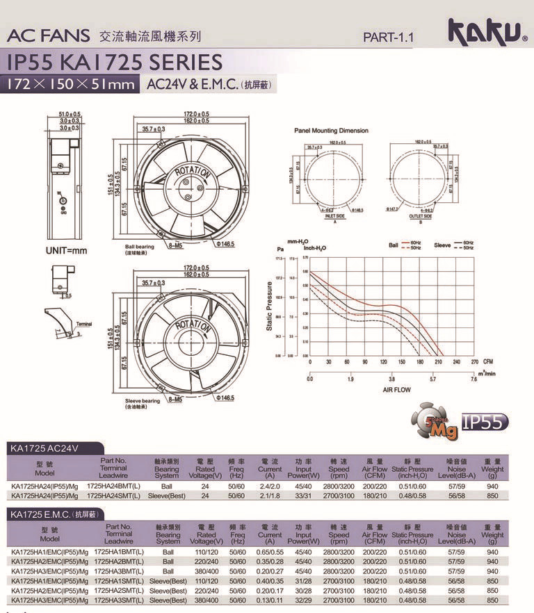 KA1725HA1/EMC(IP55)/Mg 1725HA1BMT(L) 双滚珠 110/120V 0.65/0.55A 2800/3200RPM 200/220CFM 57/59dB-A
