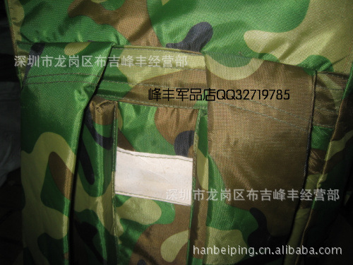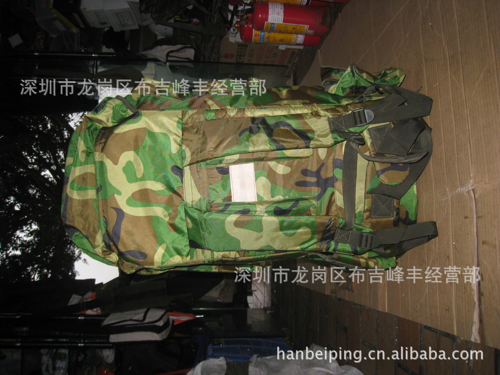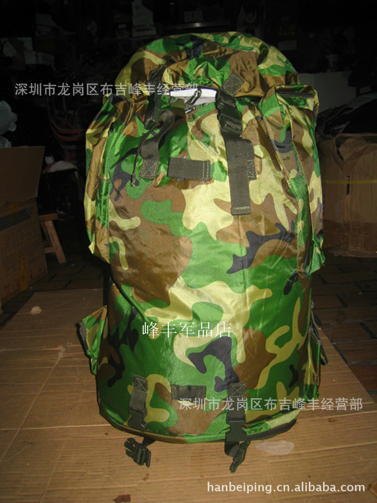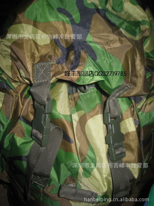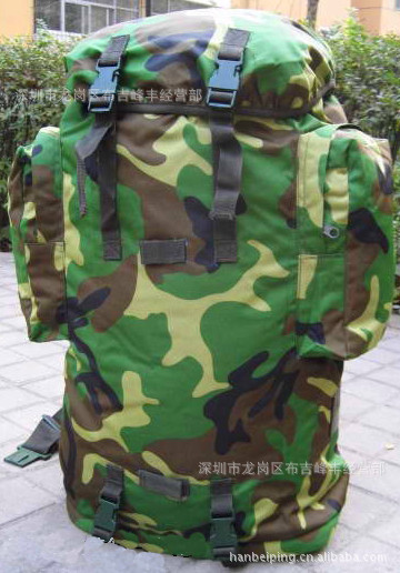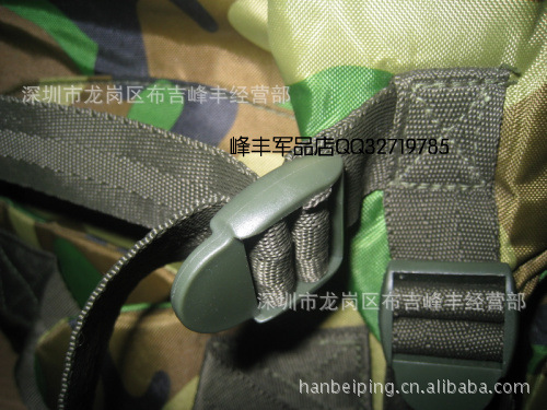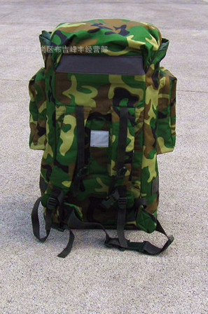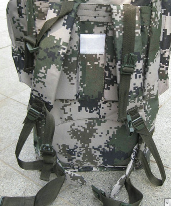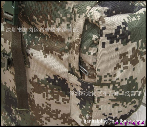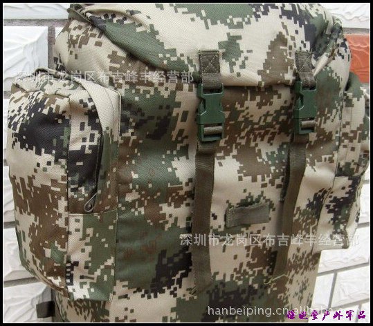 本款选用涤纶长丝迷彩涂层帆布,具有防雨拒水功能,设计上采用人体工程学原理,内有合金骨架并采用垫肩和背垫缓冲设计,背囊下部可通过腰带扣系于人体前部,尽量使之背带舒适,减轻压负感,采用上下开口和加长袋设计,方便物品装取,当携带较多物品时,加长袋可以拉出,利用上端束口绳收紧;正面有