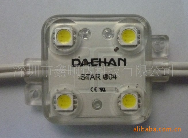 LED发光模组(4颗5050灯珠)(以上图片仅供参考)主要特点:1、采用高亮度的贴片灯珠,贴片5050(3芯/颗);2、工作输入电压为DV12;在保持相同的亮度下,产品可连接100片,完全不需要担心电压会有所下降;3、采用高温环保阻燃材料,能承受温度在-20℃---80℃之间;4、防水等级符合IP67防护等级;5、发光颜色:白色,绿色,蓝色,红色,黄色和七彩色;6、发光角度180°;色温:2700-8000K