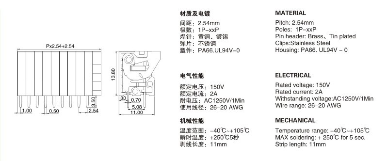 间距:2.54mm;极数:1P-xxP;额定电压/电流:150V/2A