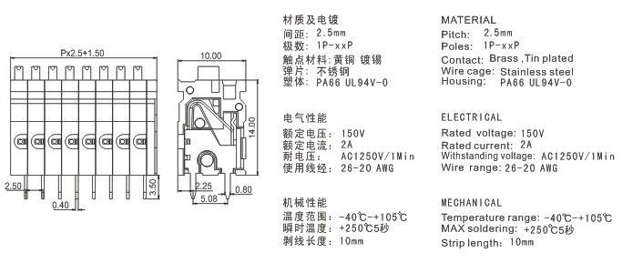 间距:2.5mm;极数:1P-xxP;额定电压/电流:150V/2A