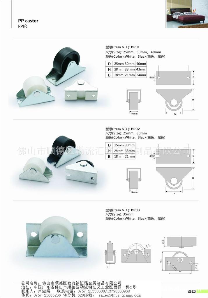 产品名称:家具轮 万向轮 脚轮 PP轮 型号:PP01 名称:PP轮,脚轮 材质:PP 铁 尺寸:D:25mm 30mm 40mm 28mm 33mm 43mm 18mm 21mm 24mm 表面处理:PP 黑色 白色 铁 镀锌 包装:1000只/箱 型号:PP02 名称:PP轮 脚轮 材质:PP 铁 描述:D:25mm 30mm H:18mm 33mm B:18mm 21mm 表面处理:PP 黑色 白色 铁件镀锌 包装:1000只/箱 型号:PP03 名称:PP轮/脚轮 材质:铁 PP 描述:直径35mm。 颜色:PP白色/黑色 铁件镀锌 包装:100只/箱 |