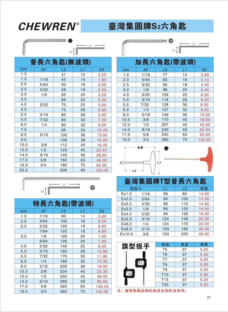 本公司总代理台湾CHEWREN集圆S2及不锈钢六角匙,普长、加长、特长平头及波头系列六角匙、T型匙、旗型匙。