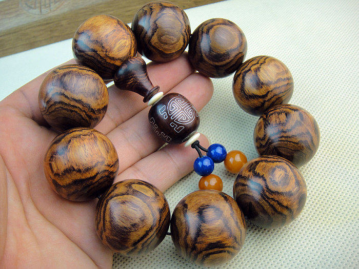 黄花梨学名降香黄檀,以产自中国海南省的黄花梨为上等,由于前期掠夺性开发,海南黄花梨已经呈现枯竭态势,目前市场上常见的黄花梨品种多产自越南、缅甸一带,但纹理层次较乱,其价值远不及海南黄花梨。所以用海南黄花梨制作的佛珠手链,被广大收藏家视为上品,当然价值不菲。