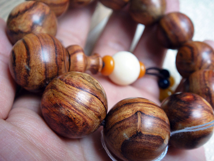 鉴别黄花梨手串其次就是看海南黄花梨手串的比重和手感,用手掂量黄花梨手串,看有没有分量,不轻飘,手感温润如玉,真正的黄花梨的成品触起来不会有戳阻手的感觉。还有一点必须要讲,就是关于海黄沉不沉水,海南黄花黎气干密度为0.82-0.94/cm3,仅有少数重的料或成品入水即沉,多数都会有点浮出水面,所以,不沉水就不是好料这样理解也是错误的。