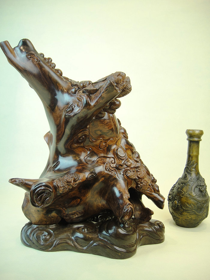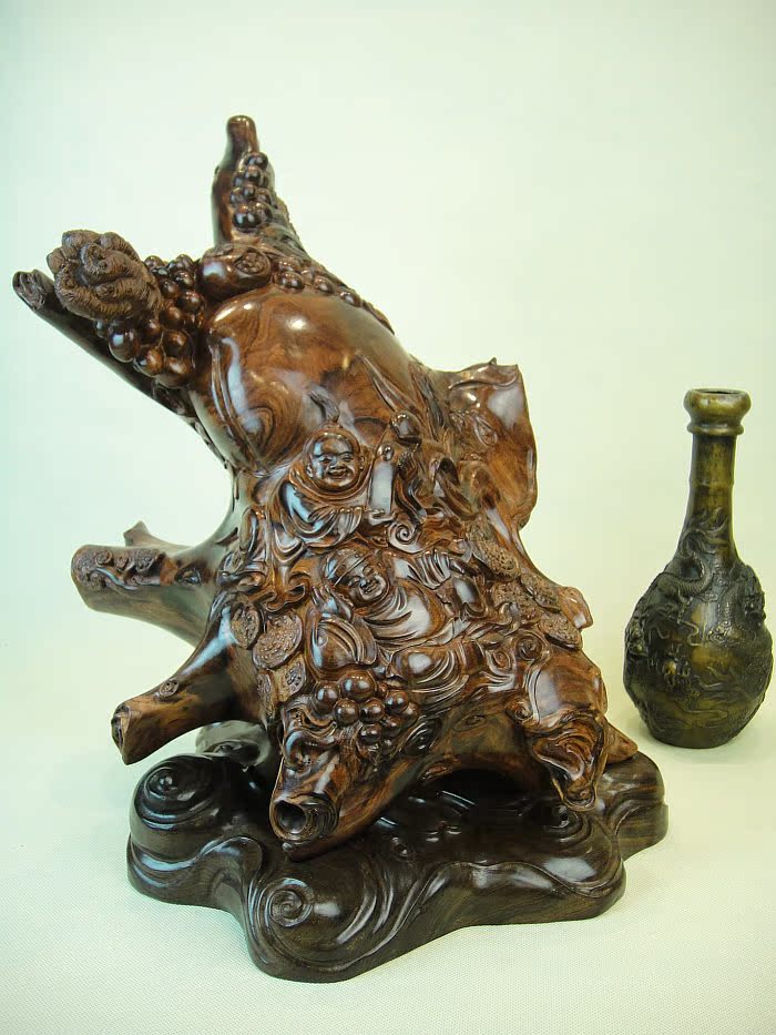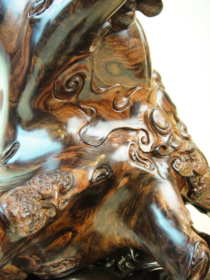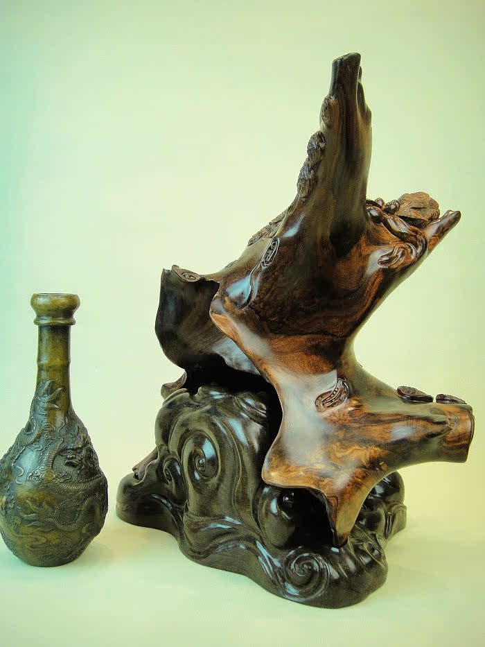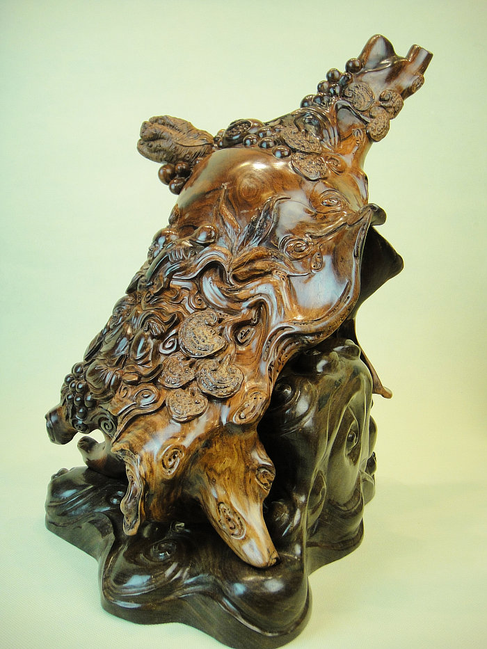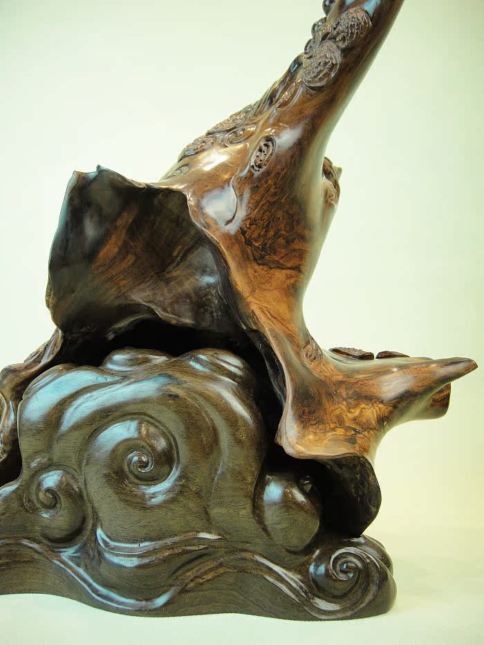 配置精细雕工的黑檀木雕底座。此为玉雕师傅精心设计,务求搭配得当,与木雕件相互辉映,达到高雅的工艺品位。