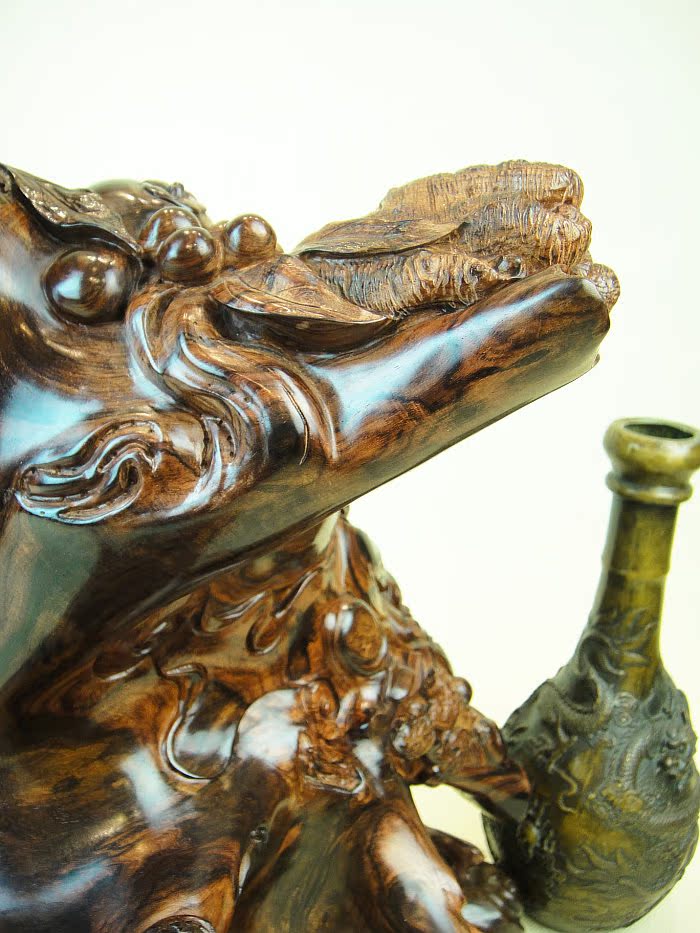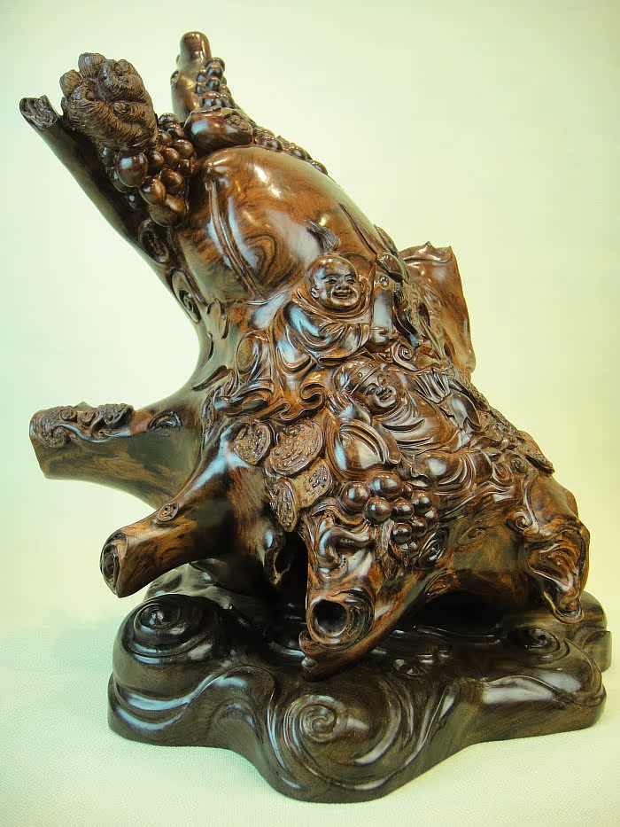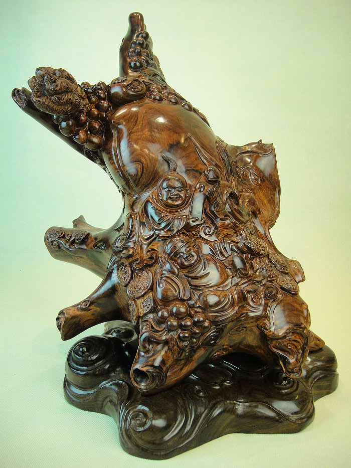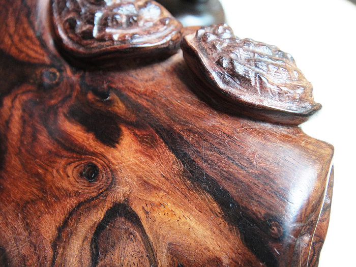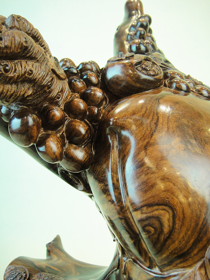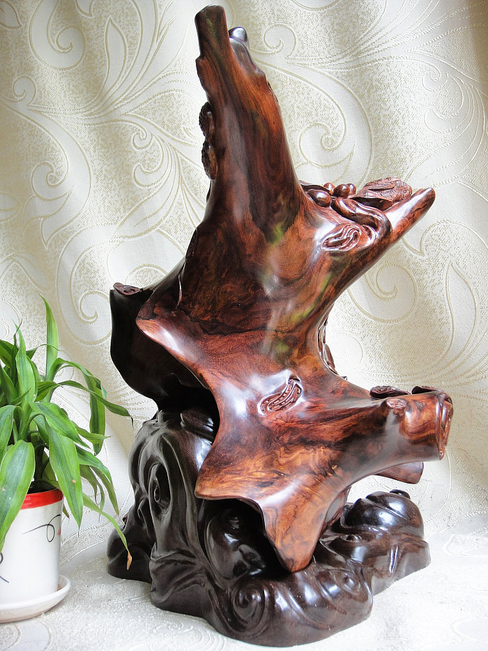 配置精细雕工的黑檀木雕底座。此为玉雕师傅精心设计,务求搭配得当,与木雕件相互辉映,达到高雅的工艺品位。