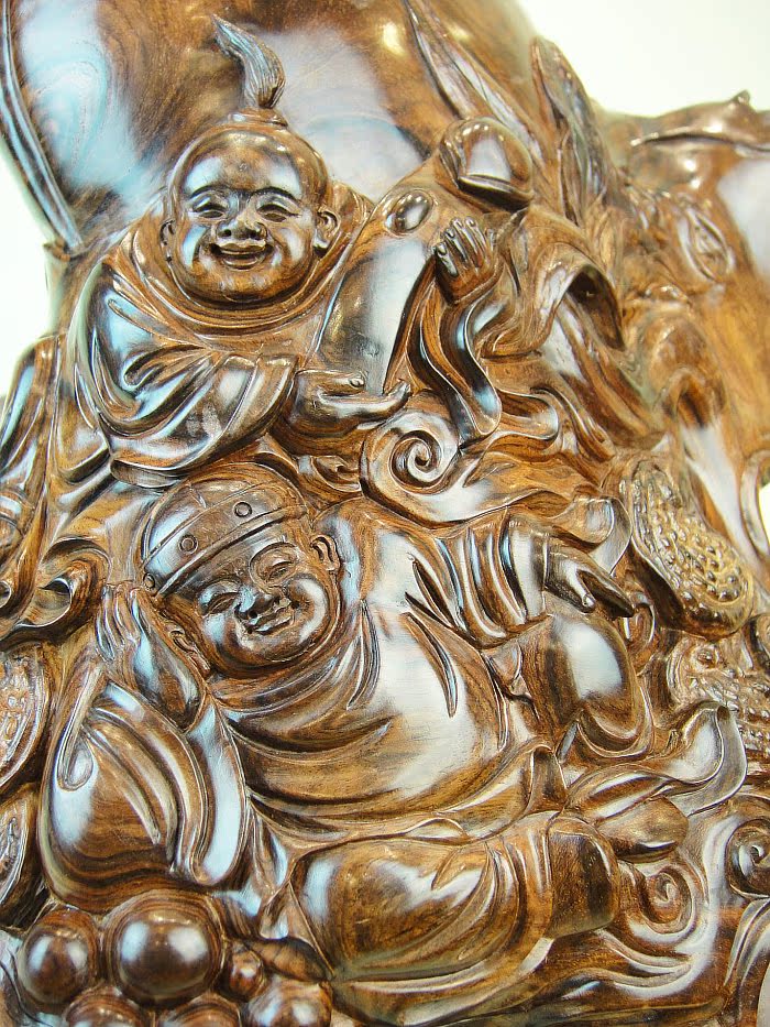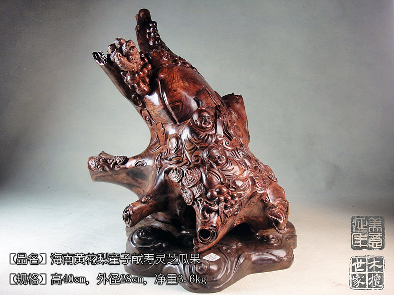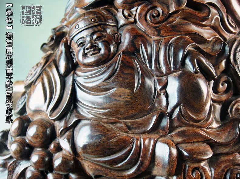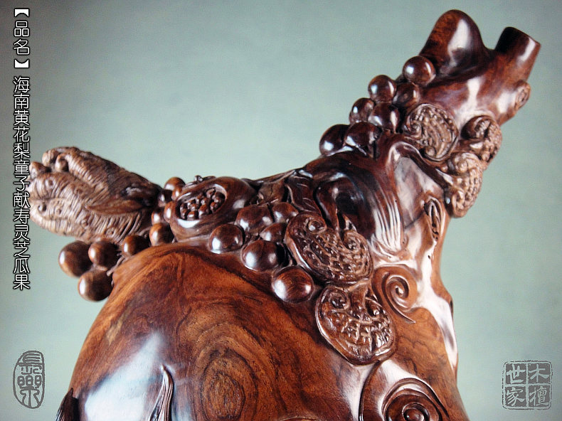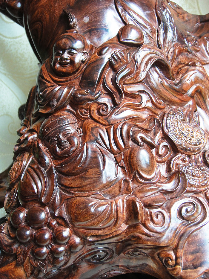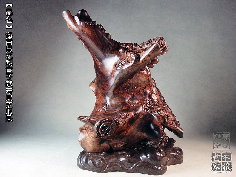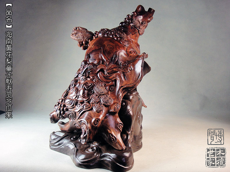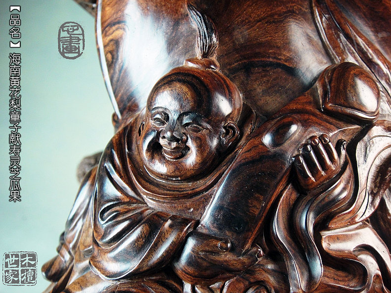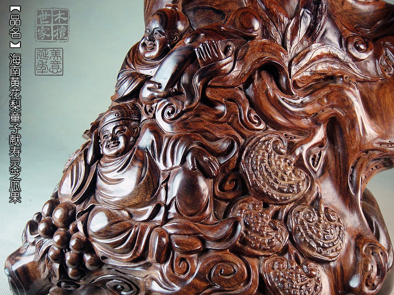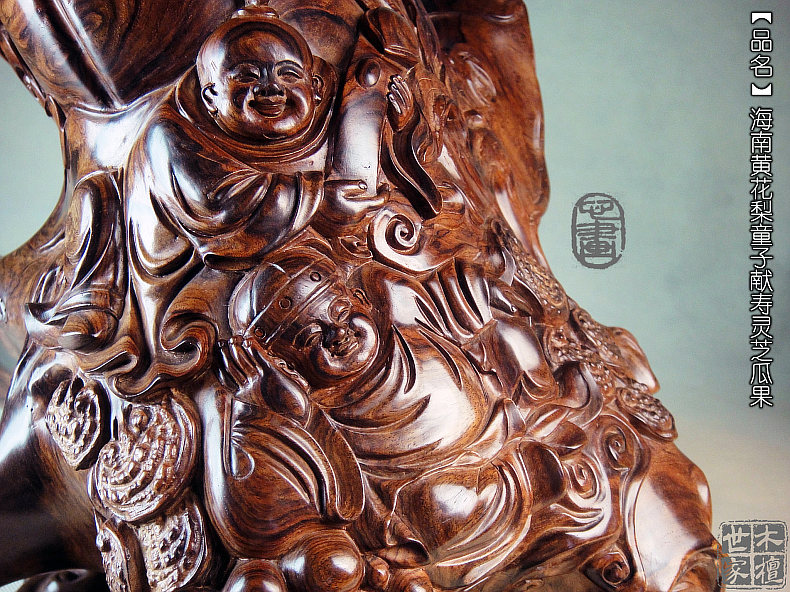 雕刻有童子、如意、佛手瓜、柿子、石榴、龙眼、寿桃、灵芝等瓜果。一多子乃石榴、 二多寿乃寿桃、三多福乃佛手、佛和福谐音故称多福。