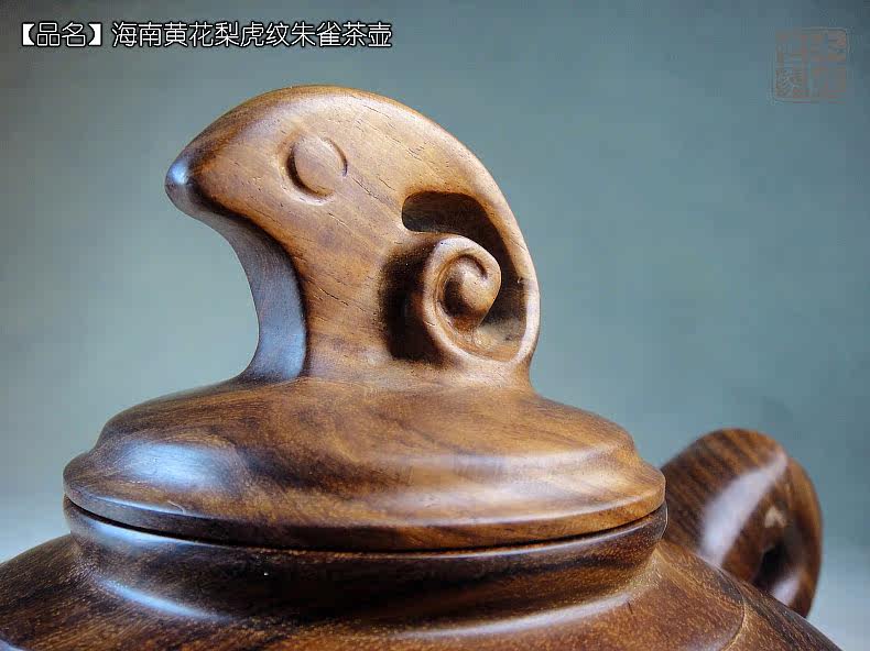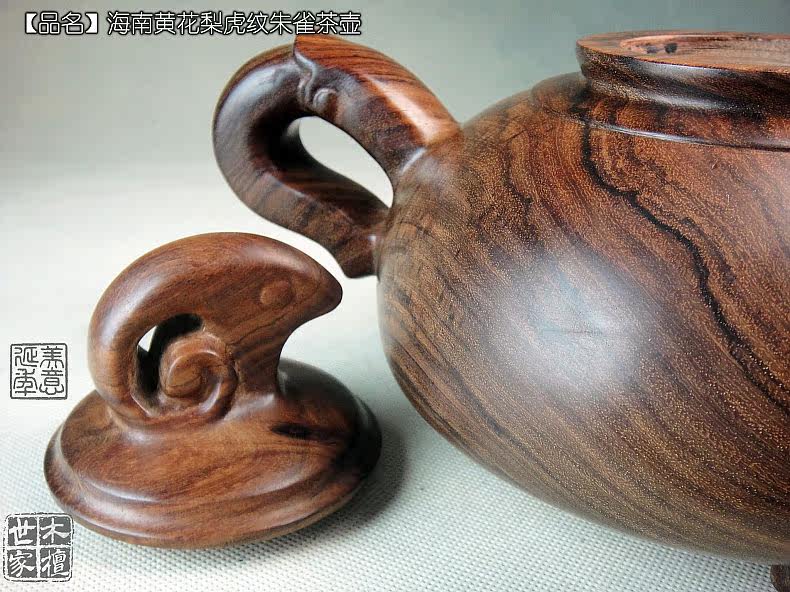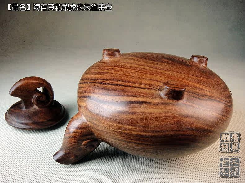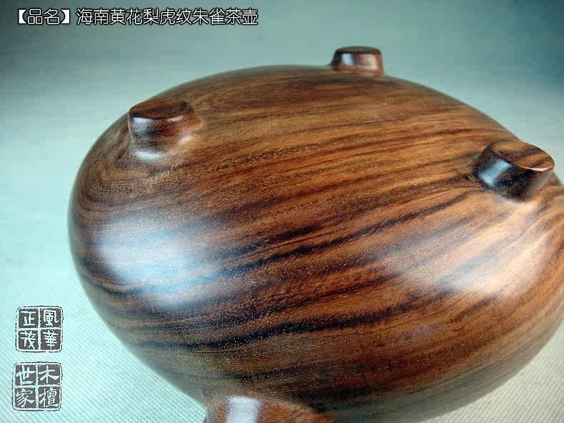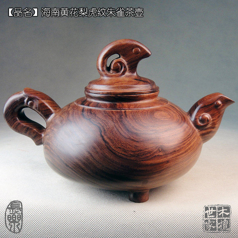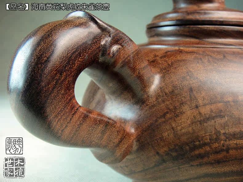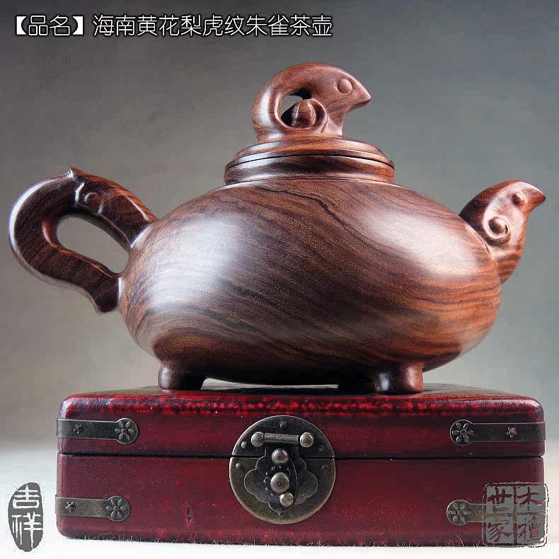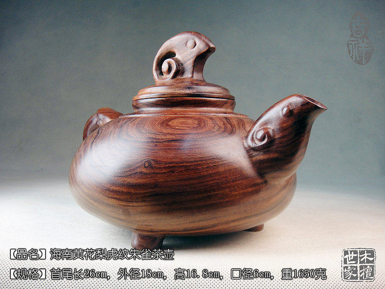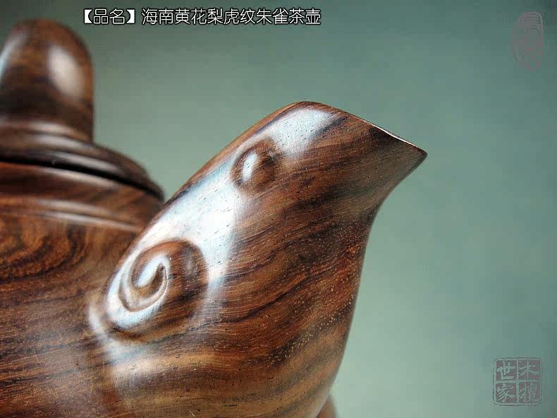 朱雀茶壶纹理漂亮,品相完美, 它所呈现的美已经给了我们视觉上很大的震撼,其表面布满了山水纹、鬼脸纹等,非常漂亮,经细抛光后手感非常顺滑,整体造型非常稳重而大气,充分的体现了海南黄花梨的特色,由于其表面纹理绚丽,色泽沉稳庄重,材质细腻,故具有很高实用价值和收藏价值!