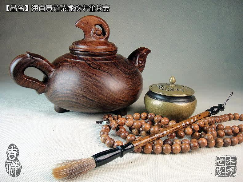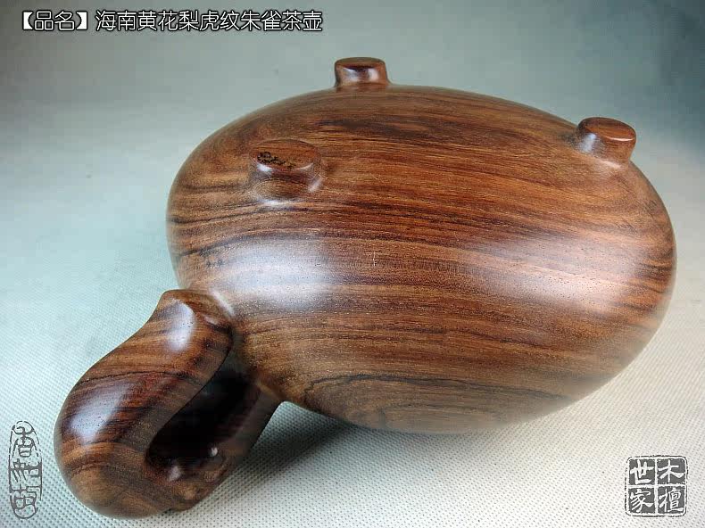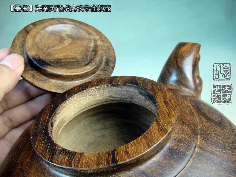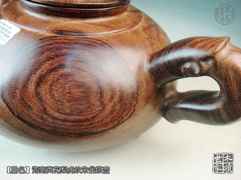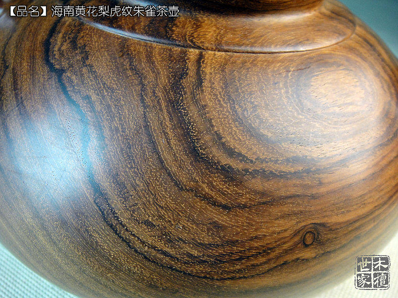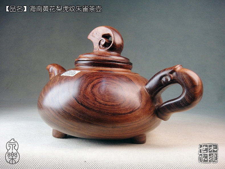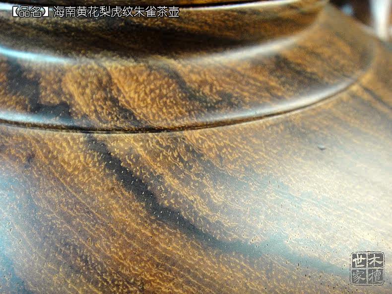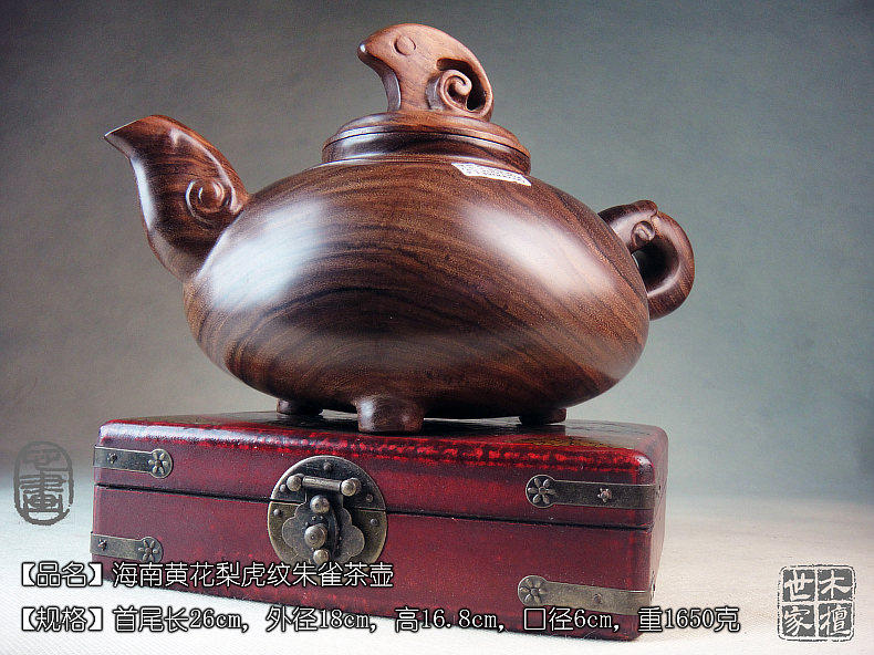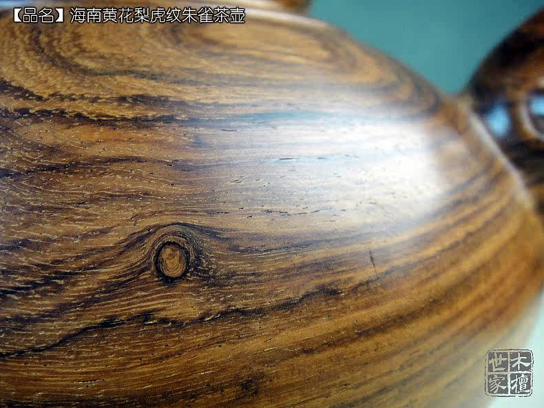 朱雀茶壶纹理漂亮,品相完美, 它所呈现的美已经给了我们视觉上很大的震撼,其表面布满了山水纹、鬼脸纹等,非常漂亮,经细抛光后手感非常顺滑,整体造型非常稳重而大气,充分的体现了海南黄花梨的特色,由于其表面纹理绚丽,色泽沉稳庄重,材质细腻,故具有很高实用价值和收藏价值!