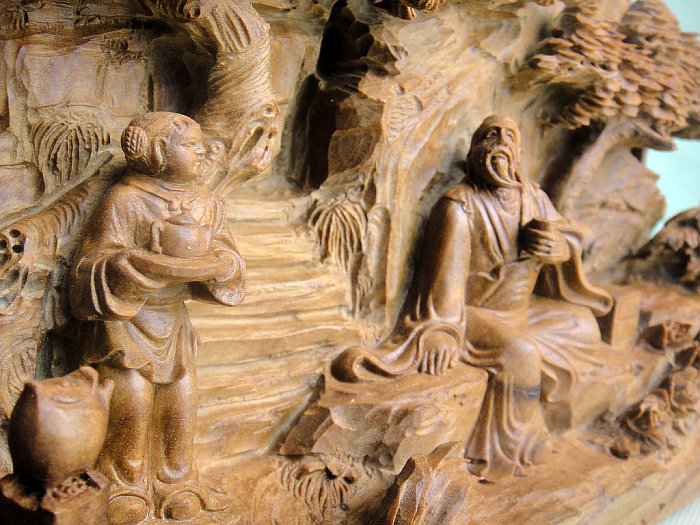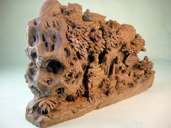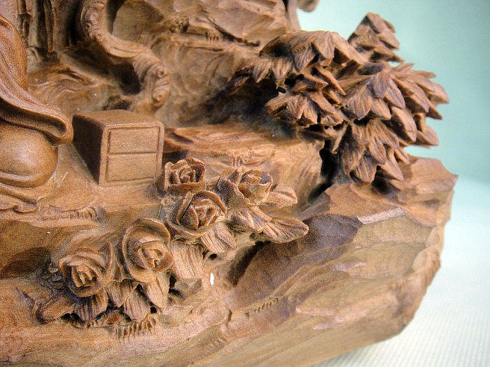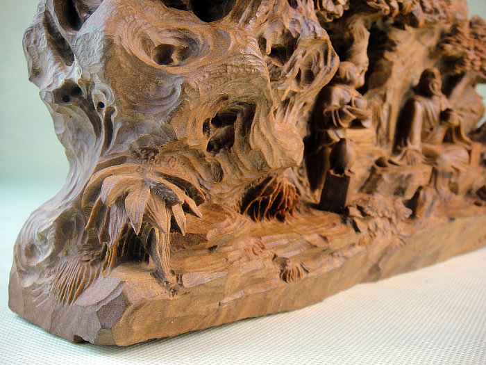 精细木雕作品,山水重叠、树木葱茏,整体大气磅礡、气象万千。再细看节点,一草一叶,一人一物,皆刻画细致,独具匠心。这件作品的价值,就在于耗费了师傅的心血和眼力,就在于这一丝一毫的精致雕工。