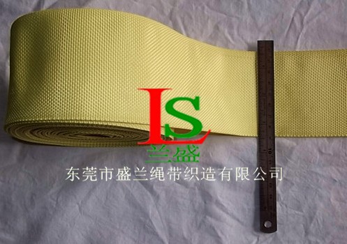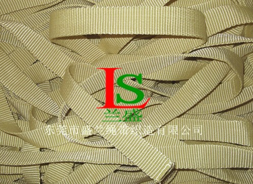东莞市盛兰绳带织造有限公司(原兰盛特殊线带厂)生产的凯芙拉绳织带是采用一种进口美国杜邦公司生产凯芙拉(Kevlar)纤维由高精度锭纺织机织造,具有高强度、高模量、耐高温、规格精准之特性。被认为是世界上最强的功能性织带。 凯夫拉织带因为有独特的高抗拉强度和低密度特性,产品多用于工业输送带、安全防护带、户外运动产品等。凯芙拉优异的特殊性能:1.高抗张、高拉力功能;2.低延伸、高模数、断裂强度高 ;3.高耐温性、抗燃性、不熔解不助燃只会碳化 ;4.高抗化学性、高稳定性、耐潜变;5.低热膨胀系数 ;6.低比重 ; 7.电的绝缘体。