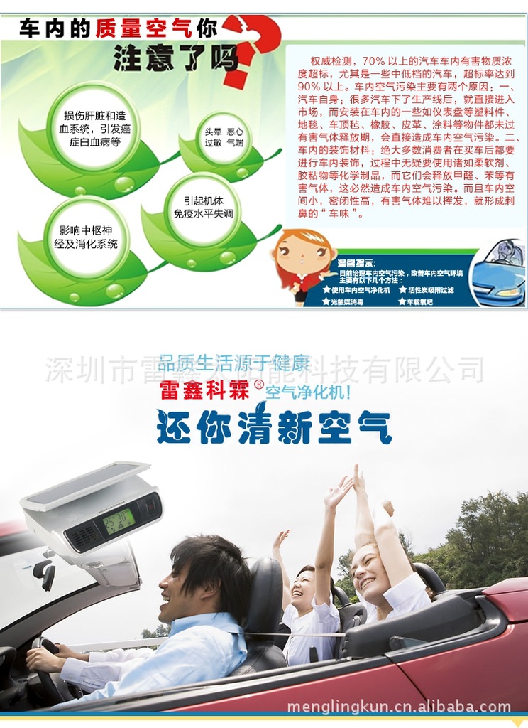 据机构检测,70%以上的汽车车内有害物质浓度都超标,尤其是一些中低档的汽车,超标率更是达到90%以上。车内的空气污染主要来源于两个方面:一、汽车自身:很多汽车下了生产线后,就直接进入了市场,而安装在车内的一些如仪表盘等塑料件、地毯、车顶毡、橡胶、皮革、涂料等物件都未过有害气体释放期,会直接造成车内空气污染。二、车内的装饰材料:绝大多数消费者在买车后都要进行车内装饰,装饰过程中无疑要使用诸如柔软剂、胶粘物等化学制品,是而它们会释放含有甲醛、苯等的有害气体,这也必然了造成车内空气污染。同时,由于汽车内空间狭小,密闭性高,这些有害气体难以挥发,从而形成刺鼻的“车味”。