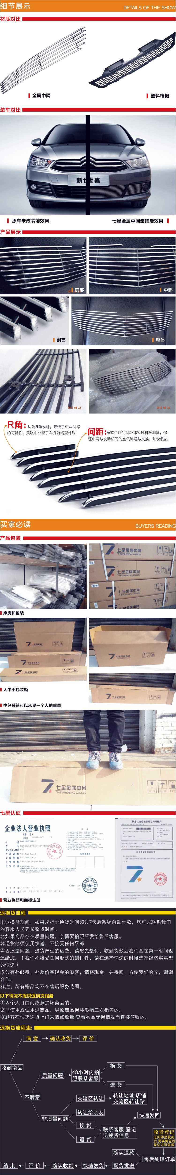 七星金属中网是由山西智汇经贸有限公司研发生产,作为国内最专业的汽车中网生产厂商之一,七星金属中网从设计之初,就秉持“五星服务,七星品质”的理念,层层把关,采用航空级纯铝材质让中网更耐腐蚀,不生锈,易保养,独到的设计,精细的雕琢,简便的安装加之特殊的抛光处理,在提升爱车“前脸”光泽度、硬度和韧性的同时,更以出众的金属质感和优秀的品质受到千万车友的好评,现有中网产品覆盖福特,通用,雪佛兰,三菱,长城,尼桑,荣威,本田,丰田,现代,起亚等世界主要汽车品牌,硬朗的线条,精心的网面设计与流畅的车身曲线完美结合,使得七星在汽车装饰界掀起一场金属中网改装风暴。