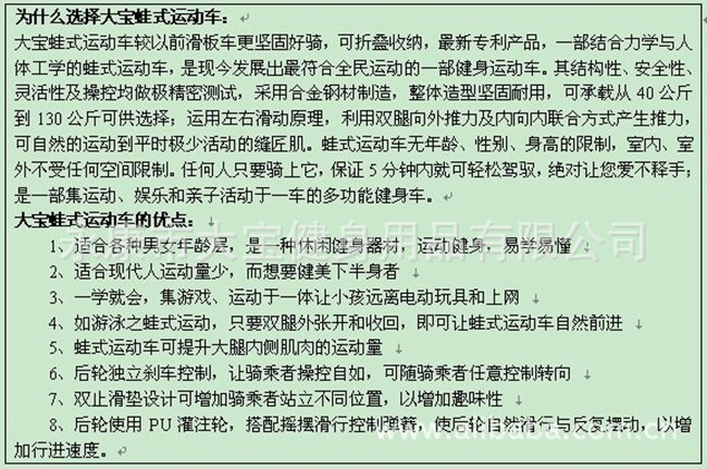 我司最先推出新一代蛙式运动车,它一举克服了老款娃式车的众多缺陷,如不能折叠只能拆卸,不能调节高度,纸盒包装携带不便,刹车线发复断裂等困扰使用者的问题,深受国内外客商的好评。欢迎咨询,洽谈合作事宜! 使用方法:象青蛙一样,将腿分开-并拢-分开-并拢,车子即可快速前进。车头转向非常灵活,让运动充满乐趣! 包装:手提袋包装,4个/箱 ,保修一年。