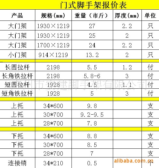 门式脚手架产品特点: 1、用途广,室内外装修,门店广告牌,桥梁,楼宇支撑,墙壁脚手架等。 2、多功能能单用,双用,能移动,使用简单快捷。 3、效率高机动灵活,快速拆装,不用螺丝,取得了事半功倍的效率。 4、承载力大,稳定性好。 5、安全可靠,接头自锁能力好,系列标准化。 6、便于管理,堆放整齐。 7、经济实用,成本低,占用空间小,使用时间长。