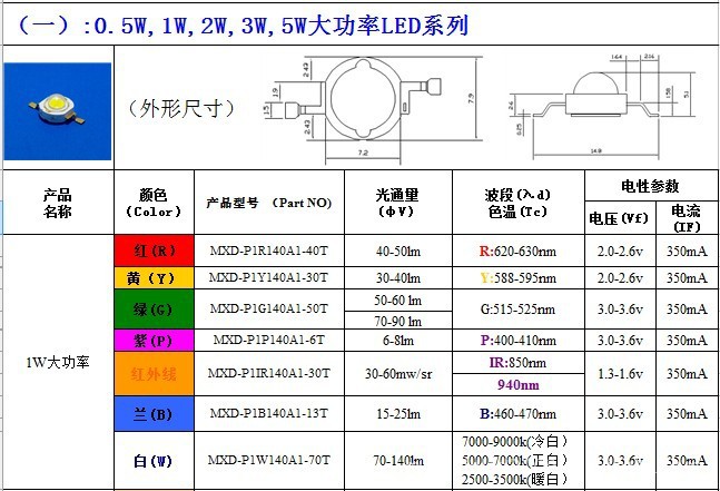 产品名称:1W-3W大功率LED灯珠