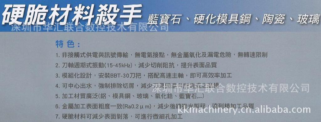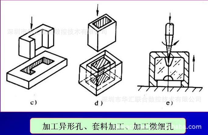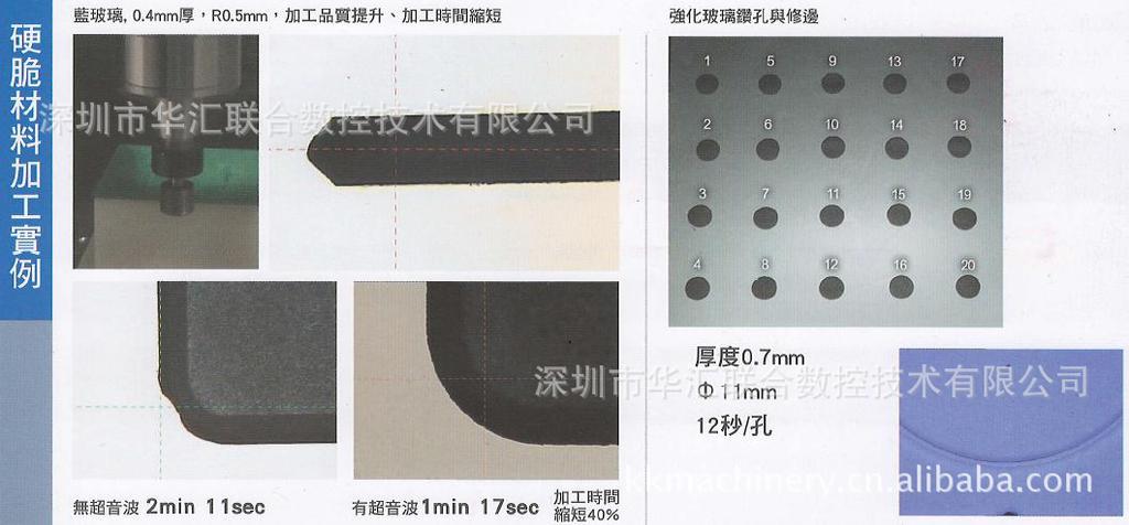1)加工速度比传统方式高出五倍加工表面光滑,不需要二次加工,适合加工超硬超脆的难切削材料,如难以加工的半导体和非金属的硬脆材料,如玻璃、陶瓷、石英、硅、玛瑙、宝石、金刚石等,或金属材料如铁、铝、钛的微细孔,深窄孔,异形孔、套料加工。