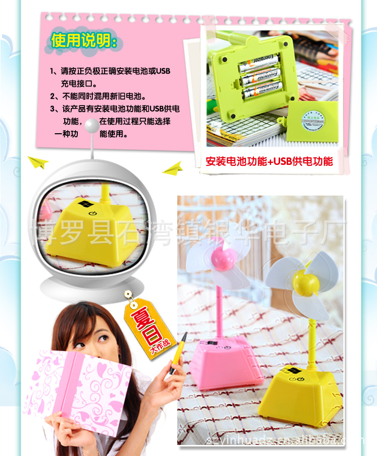 4. 如果风扇运转时风向后吹或者不能正常运转,请检查电池安装是否正确或检查USB线头接口是否正确。