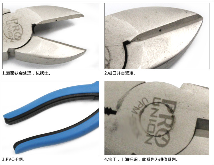 | [宝工] 压接钳 型号:UPM-067X | | | 【品名】:双色钛金斜口钳(165mm) 【规格】:型号 | 材质 | 硬度 | 手柄材质 | 剪切能力 | 全长(MM) | UPM-067X | S45C | HRC 45±3 | PVC | 硬质铁丝:1.2MM 软质铁丝:2.0MM 铜线:2.6MM | 165 | 【特点】: .本体采用S45C钢材锻造,钛金表面处理,抗锈能力特性; . 刃口经特殊硬化处理; .手柄具有防止触电的手挡设计,操作更安全。 | |