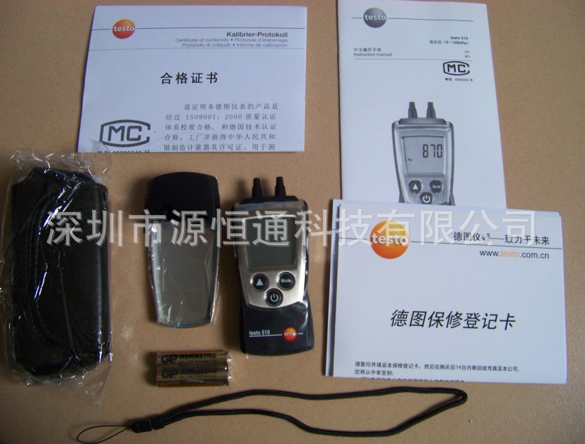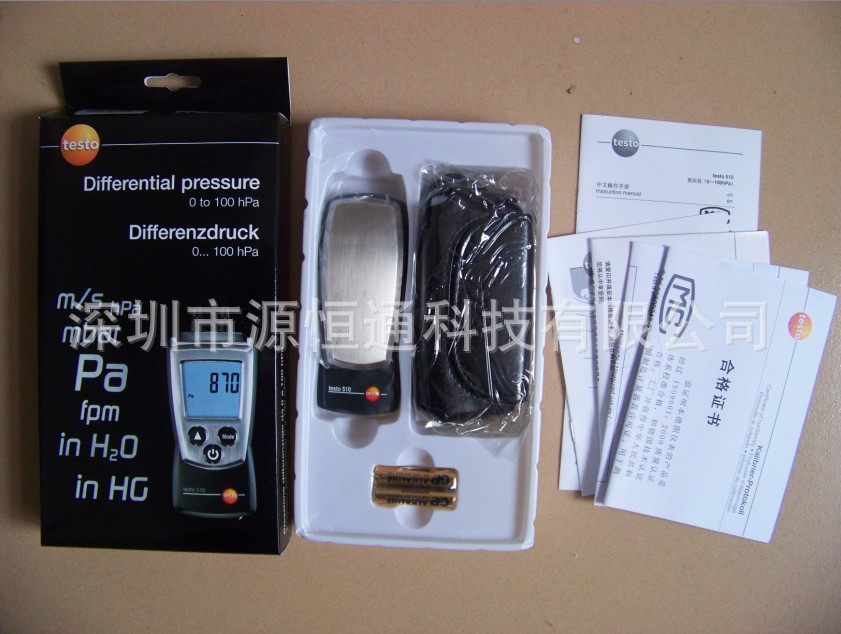 testo 510:压差测量仪,带保护帽,电池和出厂报告。