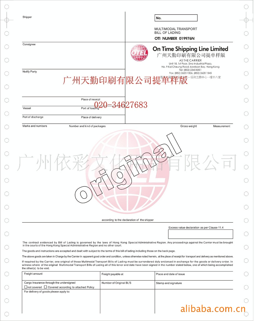 提单印刷船务提单货代提单海运提单印刷尺寸:305mm* 241mm *三正三副6联上;包装:333份/箱;材质:高级无碳复写纸;适用办公自动化系统软件打印机类型:大针式打印机(132列) 小型针式打印机(80列) 应用于国际货运代理、国际空运、国际物流、集装箱码头、国际船务公司等,我司有多种提单版本及海运条款背书,能够适用于大多数货代公司的要求