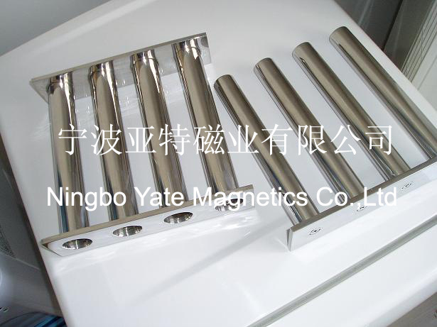 强磁磁力架是由优质无缝不锈钢管和高B值稀土合金钕铁硼,并采用特殊的制作方法制作而成的磁棒,安装在优质无缝不锈钢管构成的通体中,使用法兰将其安装在生产线输送管道中或出料口处,当含铁的物料通过时,受到磁力棒的吸引,将含铁的物质牢固的吸附在管壁上,以保证设备的完好和产品的安全。
