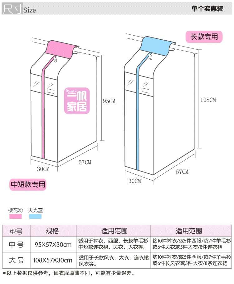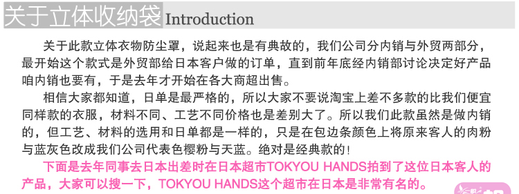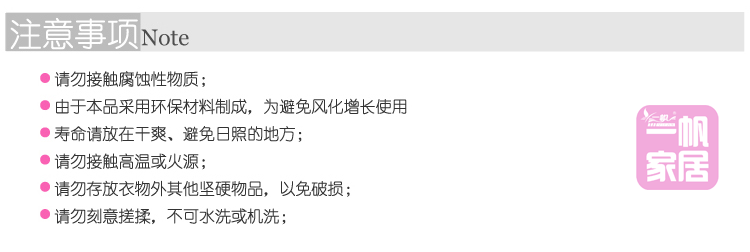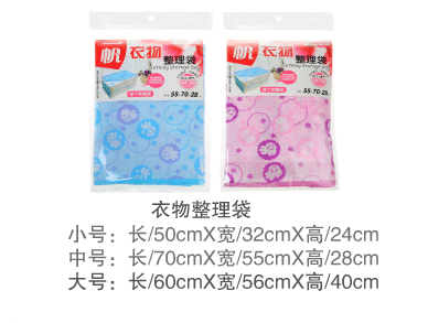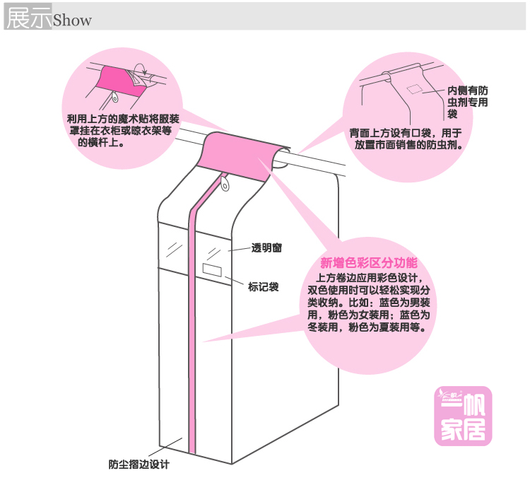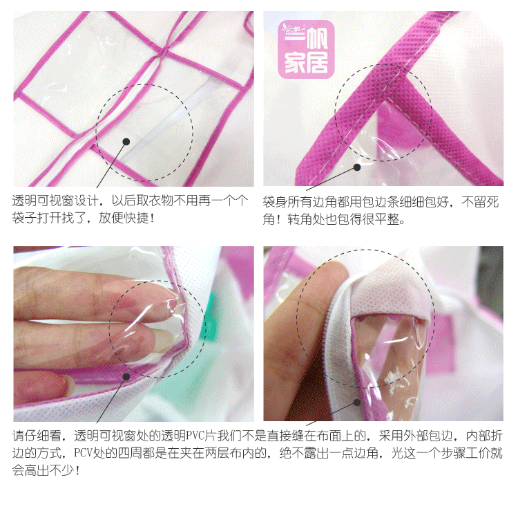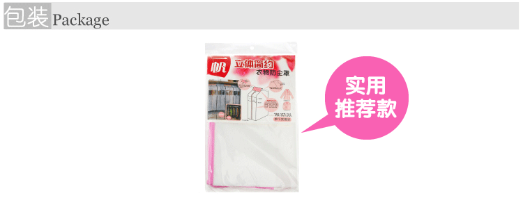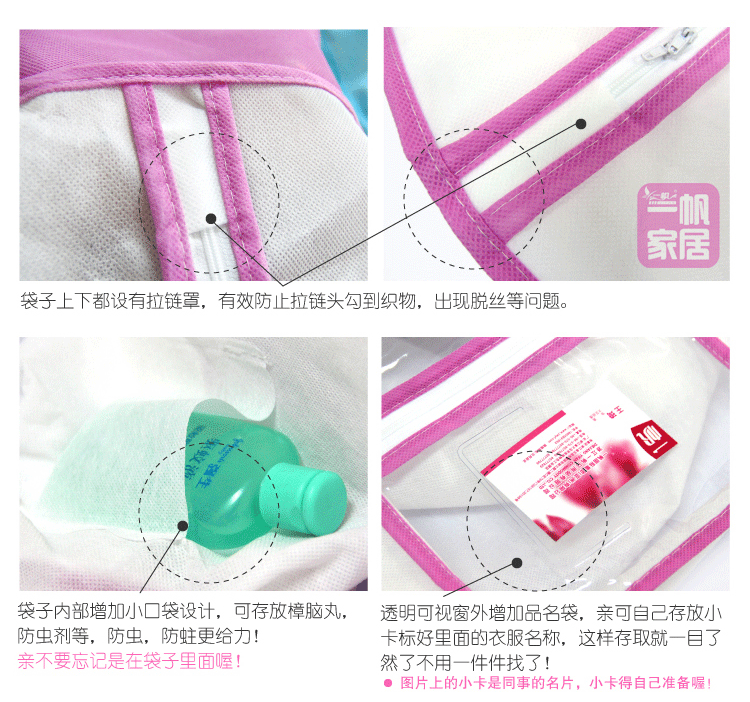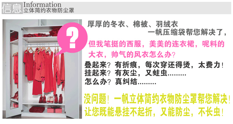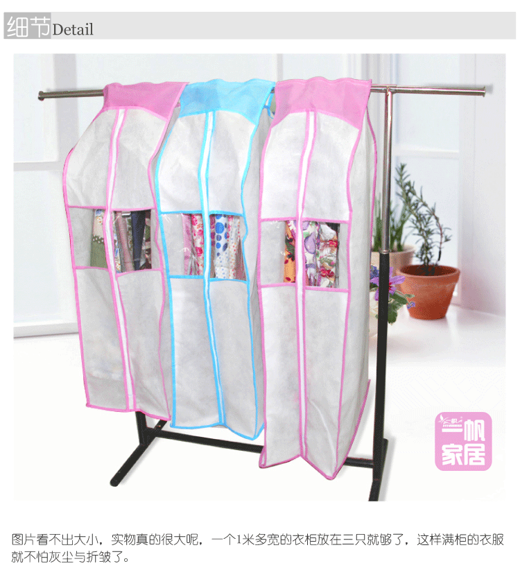 浙江一帆日用品有限公司始创于1999年,座落在全球最大的小商品集散地——中国义乌。 公司集自主研发、生产、营销于一体,专业聚焦于家居日用品行业领域,产品涉及超细纤维系列、家居装饰系列、沐浴系列、清洁系列、竹炭系列是、厨房系列等家居日用品,产品环保,健康、新颖、时尚,引领家居日用品新潮流! 公司拥有一万多平方米自主产权的现代化花园式厂区,投入资金逾三千万元,并拥有数条高精端的进口生产线;公司关注人才,中高端技术、管理类人才占全体总数的25%,并拥有70多项专利注册。13年的潜心经营,一帆已通过诸如ISO9001:2000,ISO14000国际质量管理体系等多项认证;公司实行军事化、标准化、人性化管理,大国提但是人文建设,开展丰富多彩的文化娱乐活动和管理培训,积极提升企业核心竟争力。 公司拥有品牌国内营销和外贸OEM贴牌等运营通路。外贸,行销非洲,美洲,亚洲等七十多国家和地区品牌国内销售区域的代理、加盟经销数量达七十多余家,销售网络已遍布全国,并且每年按倍率速度增长。“一帆”的每一件产品,每一个工序,都倾入了一帆人“挑战极限、追求完美”的质量理念;“爱家 家生活”的一帆人,共同致力于把“一帆”家居品牌提升到家喻户晓的高度地位!品牌: 一帆 品名: 衣物防尘罩 货号:8514 特点:容量大,有效防尘 防折皱,增加可透视窗 可以看到里面的衣物