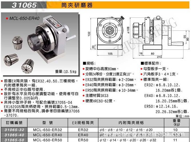 GIN-PFD-ER16夹持范围0。5-10任意大小,ER32夹持范围2-20,ER40夹持范围3-26任意大小,每种型号标配7只夹头,其余夹头加行选购
