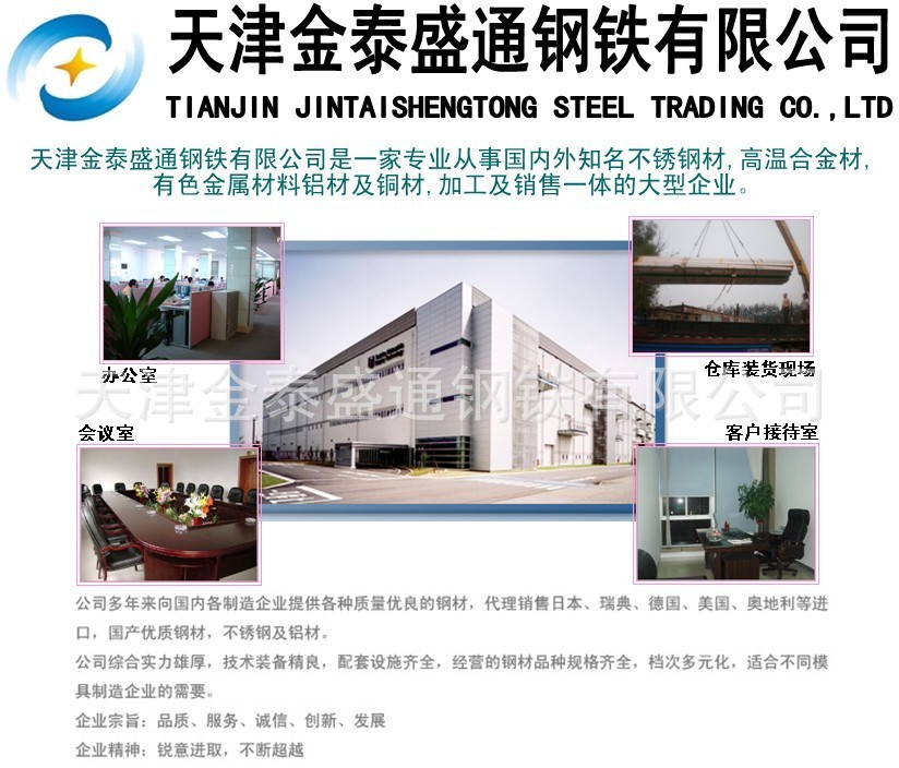 天津金泰盛通钢铁有限公司是中国最大的综合性有色金属加工基地,国家特大型企业之一。公司是制造特种铝合金材料的专业厂家,拥有成熟的生产工艺,先进生产设备。公司配有先进的卧式挤压机四台,800吨、1000吨、2200吨、3500吨,能为客户提供不同规格的铝合金挤压材料;3台立式淬火炉、4台时效炉及全套辊轿、涨拉整理设备,是生产2A12、2A11、2024、2017、2014、5A02、5A05、5083、6063、6061、6082、7A04、7A09、7075等特种工业用铝棒、铝型材料的专业厂家。原材料100%采用国产A00铝锭浇铸,并通过美国进口的贝尔德FSQ真空读光谱分析仪和德国斯派克公司进口的光谱分析仪进行分析实验,该仪器由二十个光谱通道,可在几秒钟内把铸锭成份分析出来。产品广泛用于通讯、电子、仪表、医疗、纺机、船舶、航空集装箱等工业领域和军工企业,产品遍销国内外。交货及时,代办配载托运。交货期一般为7天,急需材料3-4天内可供货。主营产品:铝材和铜材;铝材有铝板、铝棒、铝管、铝带、铝线等,材质有:5056、5052、5050、6061-T3、6061-T5、6061,1100,1200,2A12,LY12,6081,3003,价格以当日电询为准。