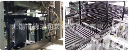 成套设备由自动沥青供料系统、自动供袋上袋机、自动保温灌装封口机、倒袋输送线、自动接袋机、自动分盘装盘系统、自动输送系统、冷却架供应系统、自动码垛机、电器控制、气动控制、真空系统等组成的机电气一体化产品。