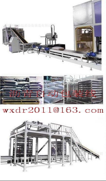 成套设备由自动沥青供料系统、自动供袋上袋机、自动保温灌装封口机、倒袋输送线、自动接袋机、自动分盘装盘系统、自动输送系统、冷却架供应系统、自动码垛机、电器控制、气动控制、真空系统等组成的机电气一体化产品。
