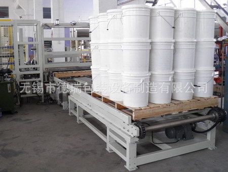 本设备是整托盘放入托盘堆放区,开机后满足条件及要求后,重托盘输送装置首先将堆垛结束的重托盘送至出口,随后自动上托盘,再自动对流水线上的圆柱平顶型马口铁桶或塑料桶进行自动整理,按要求分层堆放到规定托盘上的自动设备。