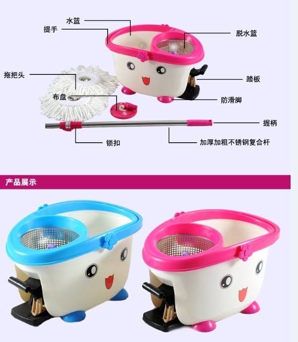 浙江胜利工贸有限公司是一家专业、专一生产好神拖的厂家。此款产品为双面带有可爱热转印印刷永不褪色并佩戴了可爱花朵帽塞。更加重要的是此款产品的拖把杆为加厚加粗的不锈钢和塑料件及加长的麻花杆,脱水和清洗时候,给我们带来极速和轻松的感觉。