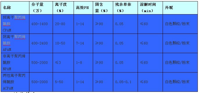 按离子特性分可分为阴离子、阳离子、非离子和两性型四种类型。本系列产品与我公司生产的无机絮凝剂(聚合氯化铝、铁盐等)同时使用,可显示出更好的效果。