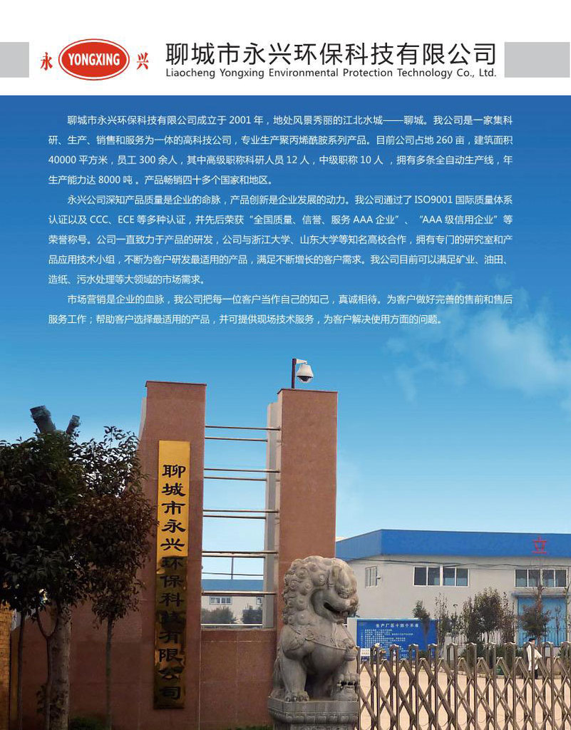 聊城市永兴环保科技有限公司自成立以来,一直致力于聚丙烯酰胺水溶性高分子的研究与开发。我公司产品质优价廉,与国内多家大型国有企业,污水处理厂以及多家代理公司签订长期供货协议,并且公司产品远销北美,中东,东南亚等世界几十个国家,深受国内外客户朋友的欢迎。公司拥有一支年轻的专业研发,销售及售后服务团队,以及严格的质量管理体系,将为您提供完善的售前咨询与售后技术支持,帮您选择最适用的产品,并提供专业的现场技术支持,帮您解决在产品使用过程中遇到的问题。