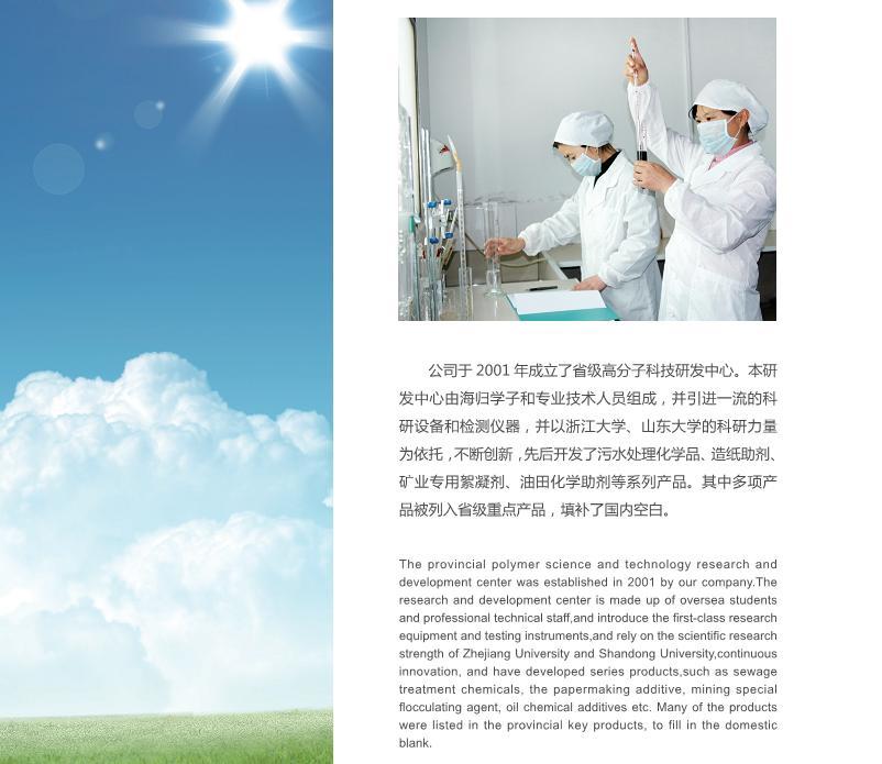 主营产品或服务:污水处理絮凝剂、阴离子聚丙烯酰胺、阳离子聚丙烯酰胺、非离子聚丙烯酰胺、两性离子聚丙烯酰胺、聚丙烯酸钾、吸水剂、造纸增强剂、选矿助剂、油田助剂、酸液增强剂等。