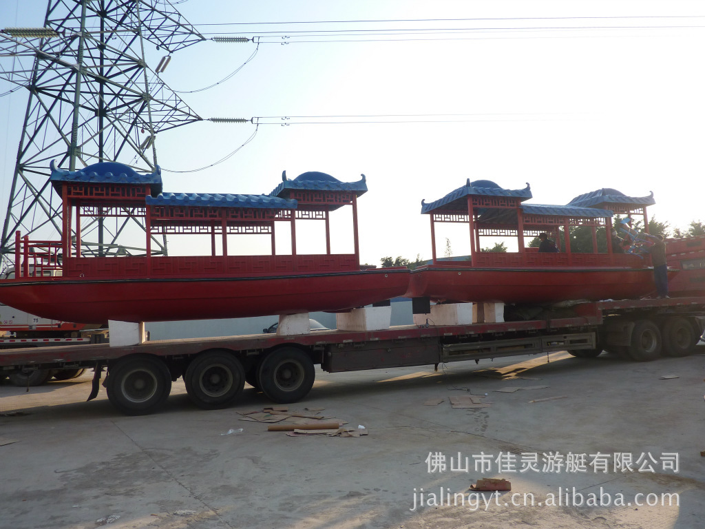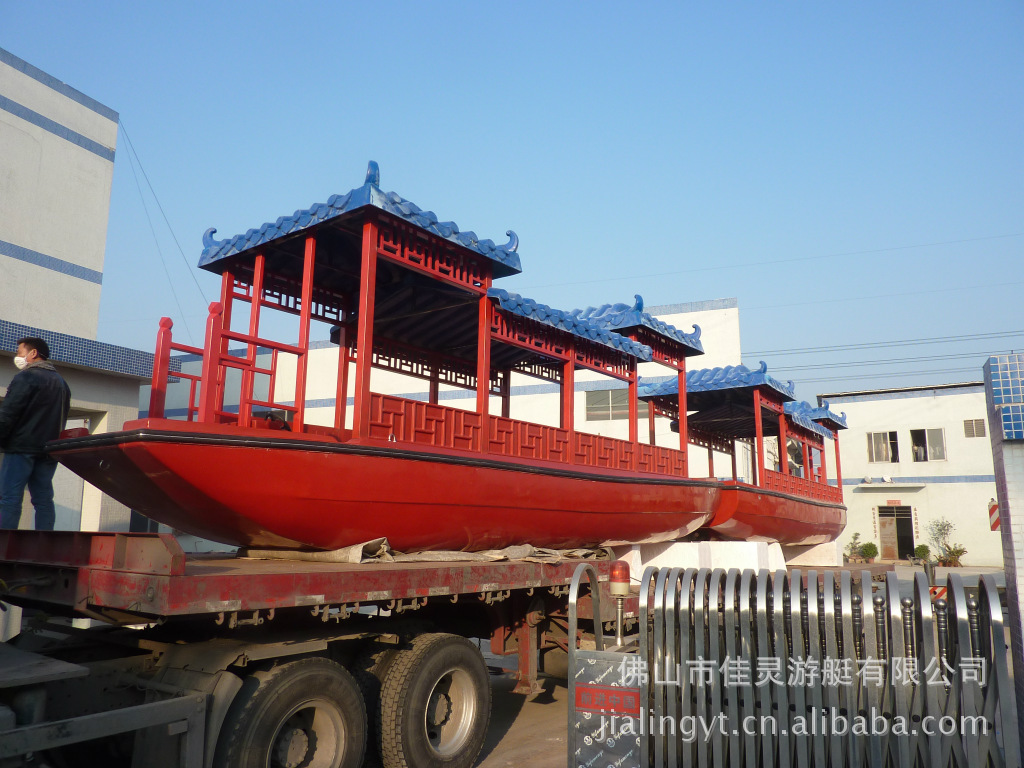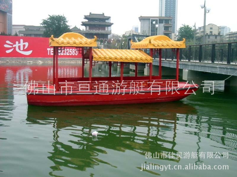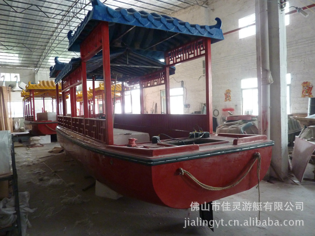 吃水:0.3m 功率:2.2kw直流电机 航速:12kw/h 电池:200ah*8只 乘员:24人玻璃钢船体,仿琉璃瓦玻璃钢质顶棚,2.2kw*48v直流电机1台,电池200ah*8个,四周玻璃钢花纹板,进口方向机机械型,CD机两喇叭1套,驾驶椅1张,铝塑板天后吊顶,充电器1个,灭火器2个,自动抽水泵1个,防撞胶条1套,防撞球4个,进口电控系统1套,船体前后铁质护栏加烤漆1套,救身衣24套。