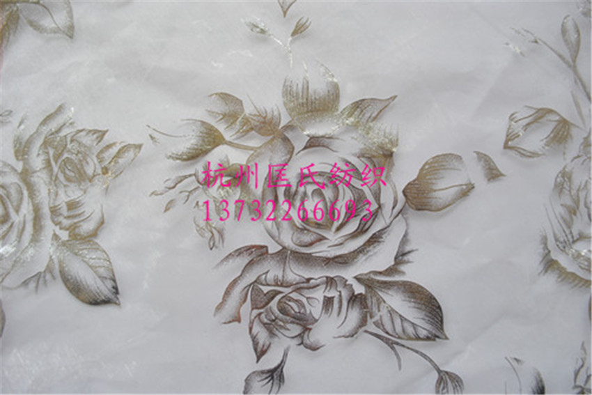 我司位于中国丝绸城——浙江杭州。 公司提供各种面料的台版印花加工、植绒加工、烫金加工、洒金印金加工等。 公司有大量的玻璃纱印花面料成品,产品广泛用于:礼品包装、舞台服装、鲜花包装、灯罩材料、玻璃夹丝材料等。
