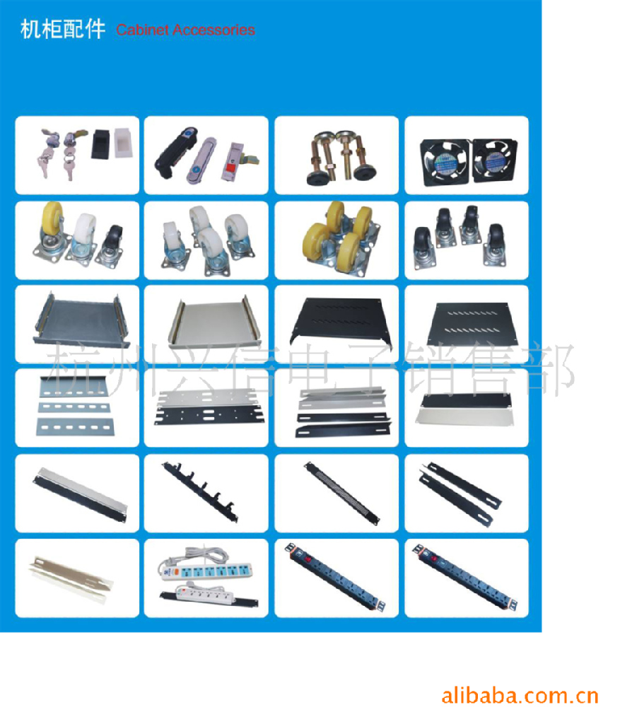 服务器机柜专用固定托盘、专用滑动托盘、电源支架、地脚轮、地脚钉、理线环、水平理线架、垂直理线架、L支架、扩展横梁等。