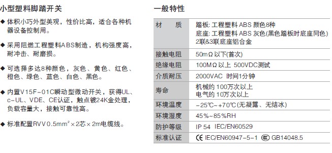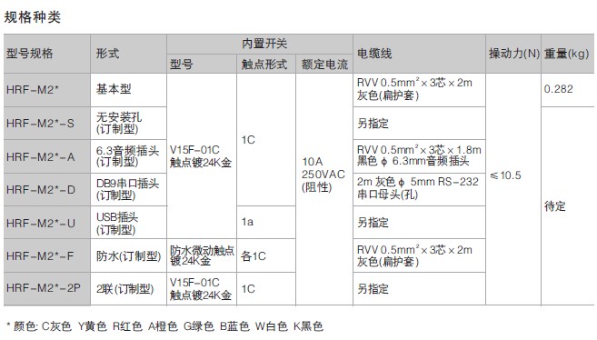| | | 型号 | 触点形式 | 额定负载 | 动作方式 | 电缆线规格 | 内置开关 | | HRF-M2□ | 1C(1a+1b) | 10A @250VAC | 复位 | RVV0.5mm²×3芯×2m | V15F-01C |