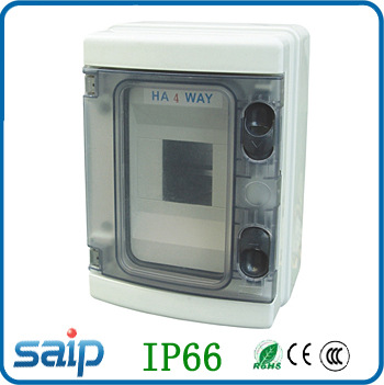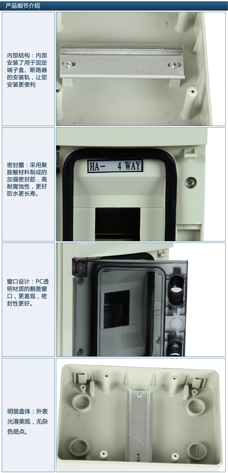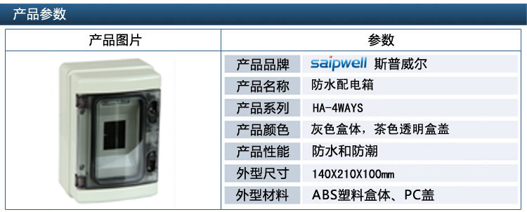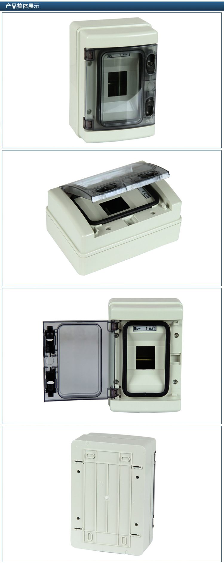 1.适用于户外,防水IP66,有效的保护断路器,空气开关等电路设备,防止雨水和湿气损坏电气。 2、面板为工程ABS材料,强度高,永不变色,透明材料为PC。 3、盖按压式开闭配电箱面盖采用按压式开闭方式,只需轻按即可开启面罩,揭开时有自锁定位的合页结构。 4、配电箱装线设计 可将导轨支撑板升到活动的最高点,安装导线时不再受狭窄空间限制,令安装容易配电箱开关设有线槽、线管出孔,易于使用各种线槽、线管。 ◆型号:HA-4ways; ◆外型尺寸:210*140*100mm  产品名称 | 规格 | 产品尺寸 ( mm ) | 装箱尺寸( cm ) | 数量 ( 只 ) | 重量 ( KG ) | HK 系列 | 5Ways | 140*140*110 | 57*57*30 | 40 | 20.5 | 8Ways | 195*195*105 | 57*41*61 | 30 | 21.5 | 12Ways | 265*195*105 | 55*54*41 | 20 | 17.5 | 18Ways | 380*195*105 | 55*54*61 | 15 | 19 | HA 系列 | 4Ways | 140*210*110 | 52*43*44 | 30 | 20.5 | 8Ways | 215*210*100 | 52*44*65 | 30 | 21.5 | 12Ways | 300*260*140 | 73*31*54 | 10 | 19 | 18Ways | 410*285*142 | 73*29*44 | 5 | 22.5 | 24Ways | 415*300*140 | 73*31*44 | 5 | 15 | HT 系列 | 5Ways | 120*160*90 | 48*33*50 | 40 | 16 | 8Ways | 200*155*95 | 50*32*62 | 30 | 19.5 | 12Ways | 250*195*110 | 57*51*41 | 20 | 17.5 | 15Ways | 310*200*110 | 57*32*62 | 15 | 21 | 18Ways | 365*195*110 | 57*38*60 | 15 | 20 | 24Ways | 360*280*110 | 57*37*58 | 10 | 22 | SPS 系列 | 1Ways | 175*85*100 | | | | 2Ways | 175*85*100 | | | | 3Ways | 175*85*100 | | | | SPB 系列 | 1Ways | 200*100*100 | 55*22*55 | 20 | 15 | 2Ways | 200*100*100 | 55*22*55 | 20 | 15 | 3Ways | 200*100*100 | 55*22*55 | 20 | 15 | 4Ways | 200*100*100 | 55*22*55 | 20 | 15 |