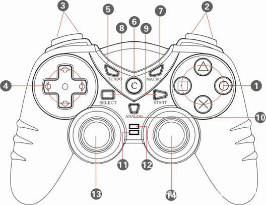 13、左摇杆:在模拟模式下控制方向(根据游戏而定)。下压为功能L3键