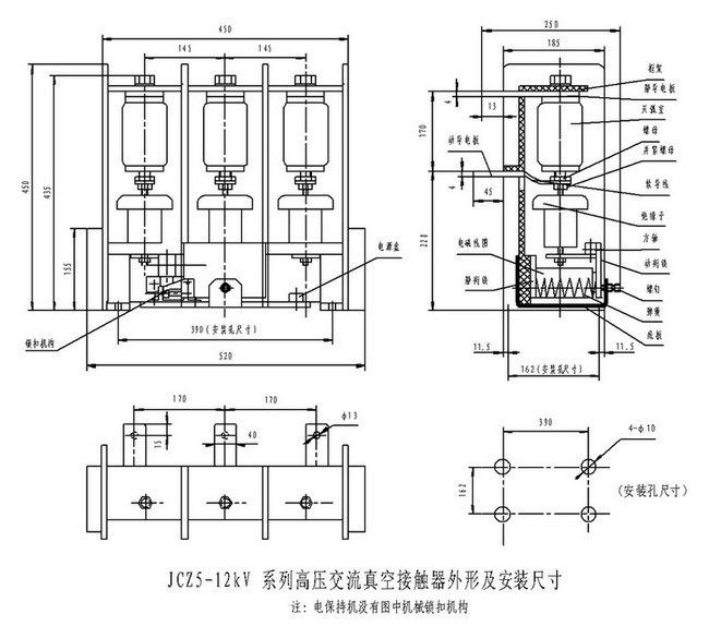 ●JCZ5系列交流真空接触器适用于交流50HZ-60HZ,额定工作电压3.6KV、7.2KV、12KV,额定工作电流200A、400A、630A的三相户内电气系统中,可直接或远距离频繁操作电动机、变压器、容性负载等用电设备。 ●JCZ5D(J)/系列交流真空接触器具有电保持和机械保持两种方式,控制电压为AC或DC110V/220V。 ●南方电器JCZ5系列交流真空接触器主要特点是采用整体框架结构,具有性能稳定、使用可靠、结构紧凑、体积小等显著特点,是3.6KV、7.2KV、12KV电压等级中理想的开关设备。