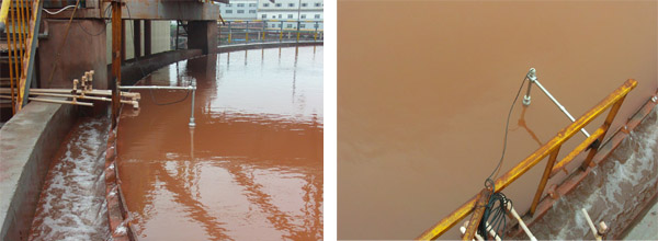 在有腐蚀性水质中,传感器浸入水中5-10cm就可工作,利用超声波发射与水中固体悬浮物回波分析,来确定污泥层的高度。
