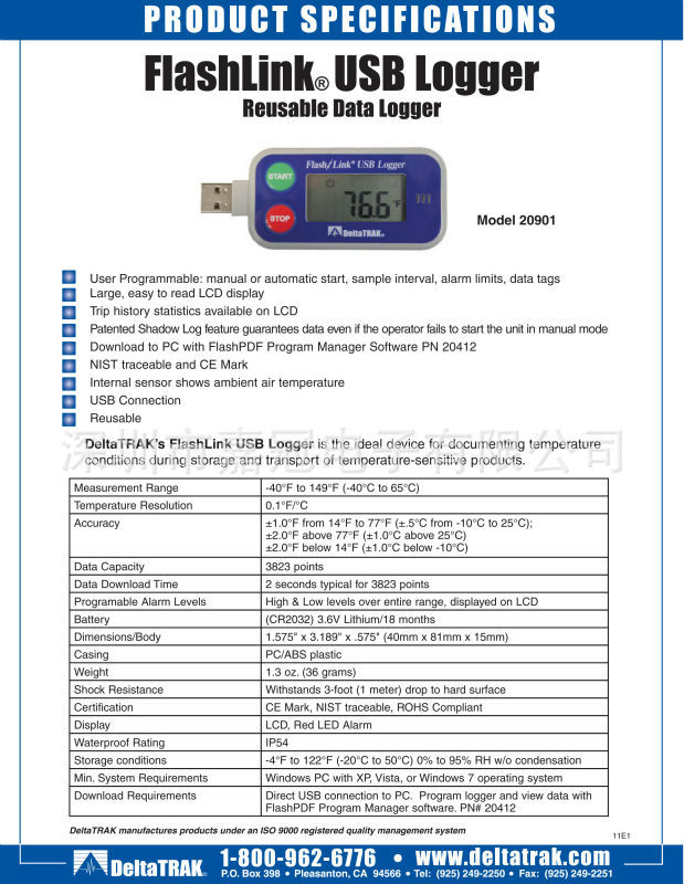 下载要求 | USB直接连接记录仪到PC。编程和查看数据用FlashPDF Program Manager software. 型号20412 |