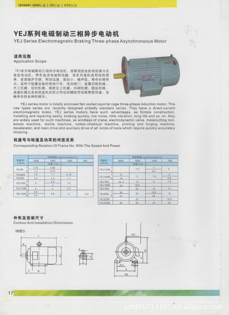 YEJ系列电磁制动三相异步电动机,是在Y系列电动机的后端盖与风扇之间附加一个直流盘式电磁制动器组成的,具有制动可靠、制动力矩可调、转子无轴向窜动,使用方便等特点,适用于各类要求快速制动、准确定位、往复运转的机械设备。