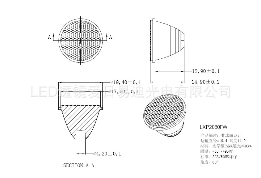 本产品采用高精度,非球面光学设计,采用德国原装进口光学级PMMA原料,保证足够的注塑成型时(降低产品缩水率)我们有优良的品质部,对产品要求及其严格,全部符合国家及出口标准,对产品采用防静电防震包装。所有产品均通过SGS认证及符合ROHS环保要求。