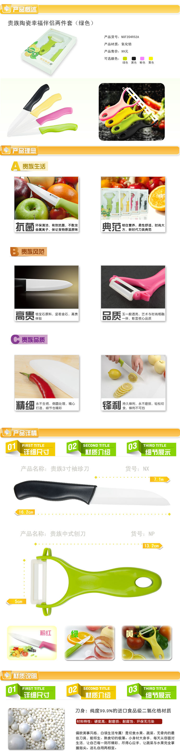 贵族品牌一直最求洁净、品质以及。贵族品牌一直致力成为陶瓷刀行业品质典范,引领陶瓷刀行业时尚潮流,以追求卓越创引精致生活的理念,竭力把我们的服务做到极致。贵族特种陶瓷刀是指采用纳米高纯度超微精细氧化锆粉粒经过成型、等静压、烧结以及精密加工而成的高科技产品。同钢刀相比,陶瓷刀具有如下几大特点。