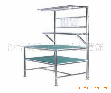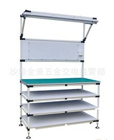 工作台由线棒及接头配件组合而成具有拆卸方便,组装灵活,提高生产效率等特点。适用于各电子行业检测,维修使用。通过其排列可组成各种形式的工作站。工作台是为工厂的组装、生产、维修、操作等工作而专门设计。它的台面经特殊处理,具有防腐、防静电等特性,多种台面选择,可配合不同的使用要求。所配置的抽屉、柜门方便使用者存储工具。工作台系列采用标准配置有:照明灯,报警灯,风批挂铝,工艺指导书挂钩,排插,开关,仪表台,气管,脚轮,调节脚等等。按客户所需而配置。加装工具柜后能更合理的利用空间,存放并保护工具。